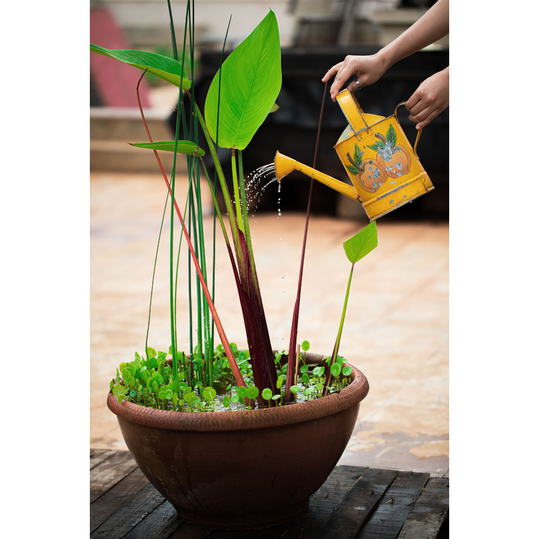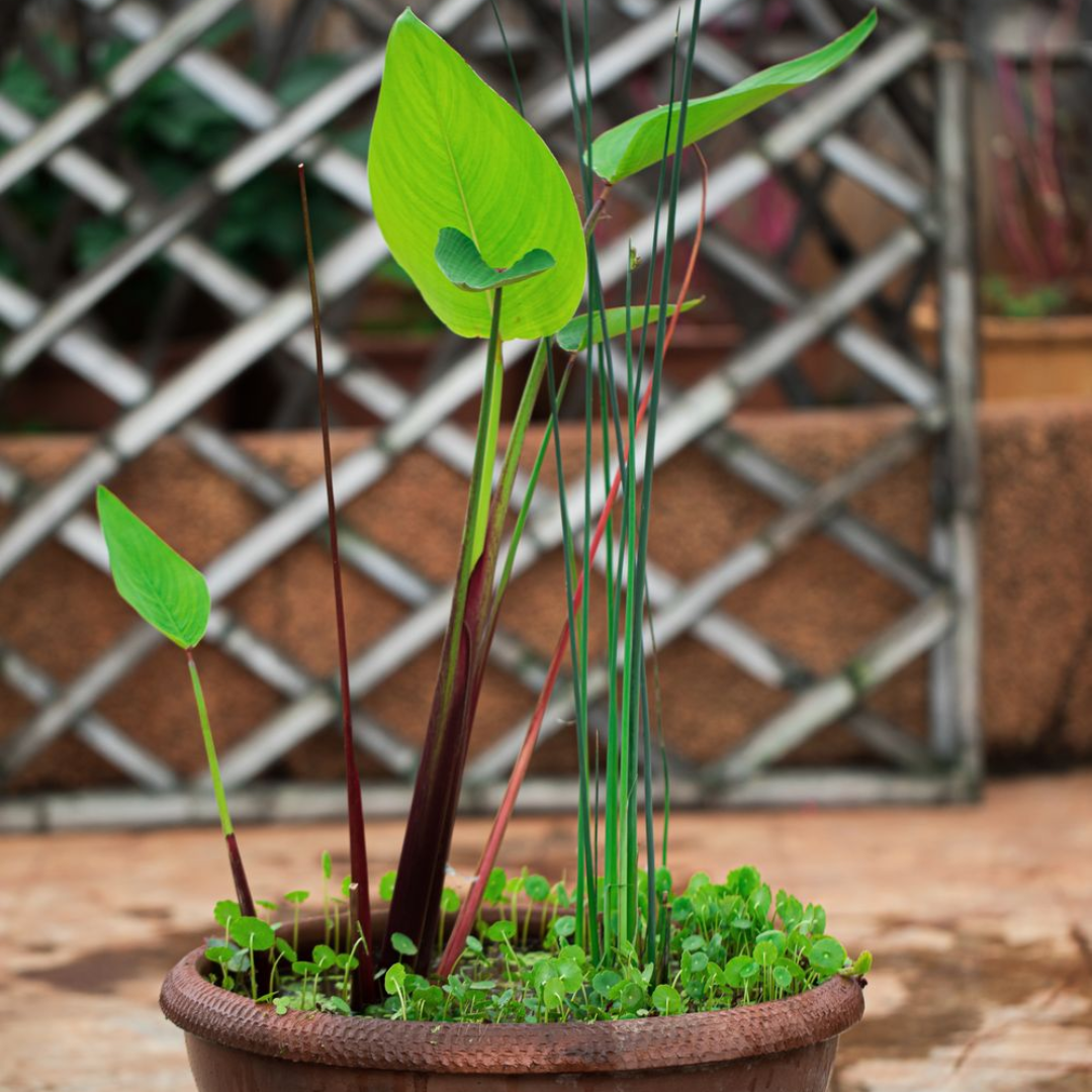 This product contains three species of aquatic plants in a terracotta urli.