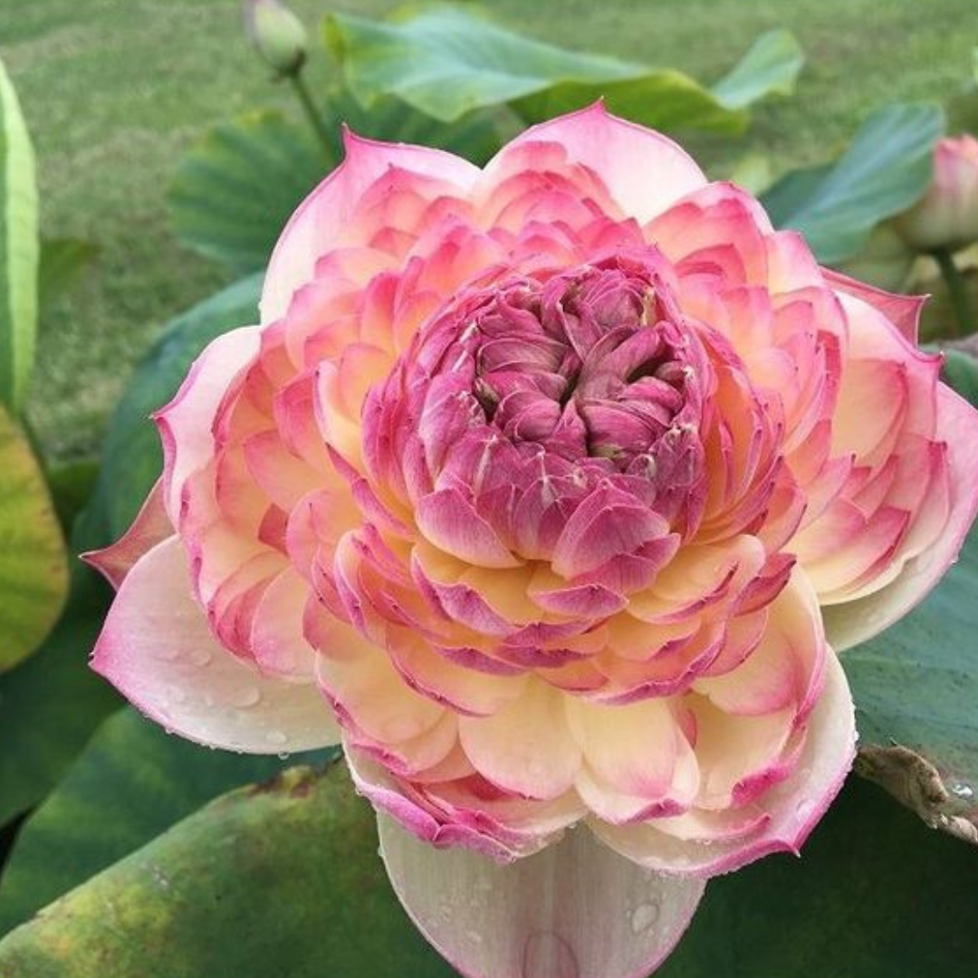 Charming lips is a double petalled lotus variety with colours varrying from yellow in center to pink/purple-violet at the tips. The flower produce directly correspond to the size of the container used- small container- small sized blooms, larger container- larger blooms. The flower's height ranges between 21-54cm and the diameter ranges from 10-12cm. Full Sun is well suited for its growth.
