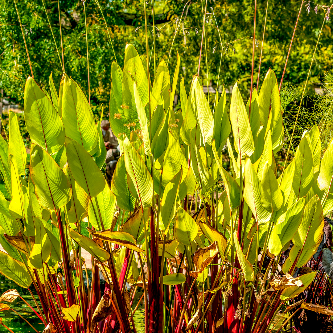 Thalia geniculata is a beautiful aquatic plant with stems streaked in brilliant red that adds a striking effect in water features. It has smooth, shiny foliage, the leaf blade is held by a long, smooth red-purple petiole. It performs well in sun.